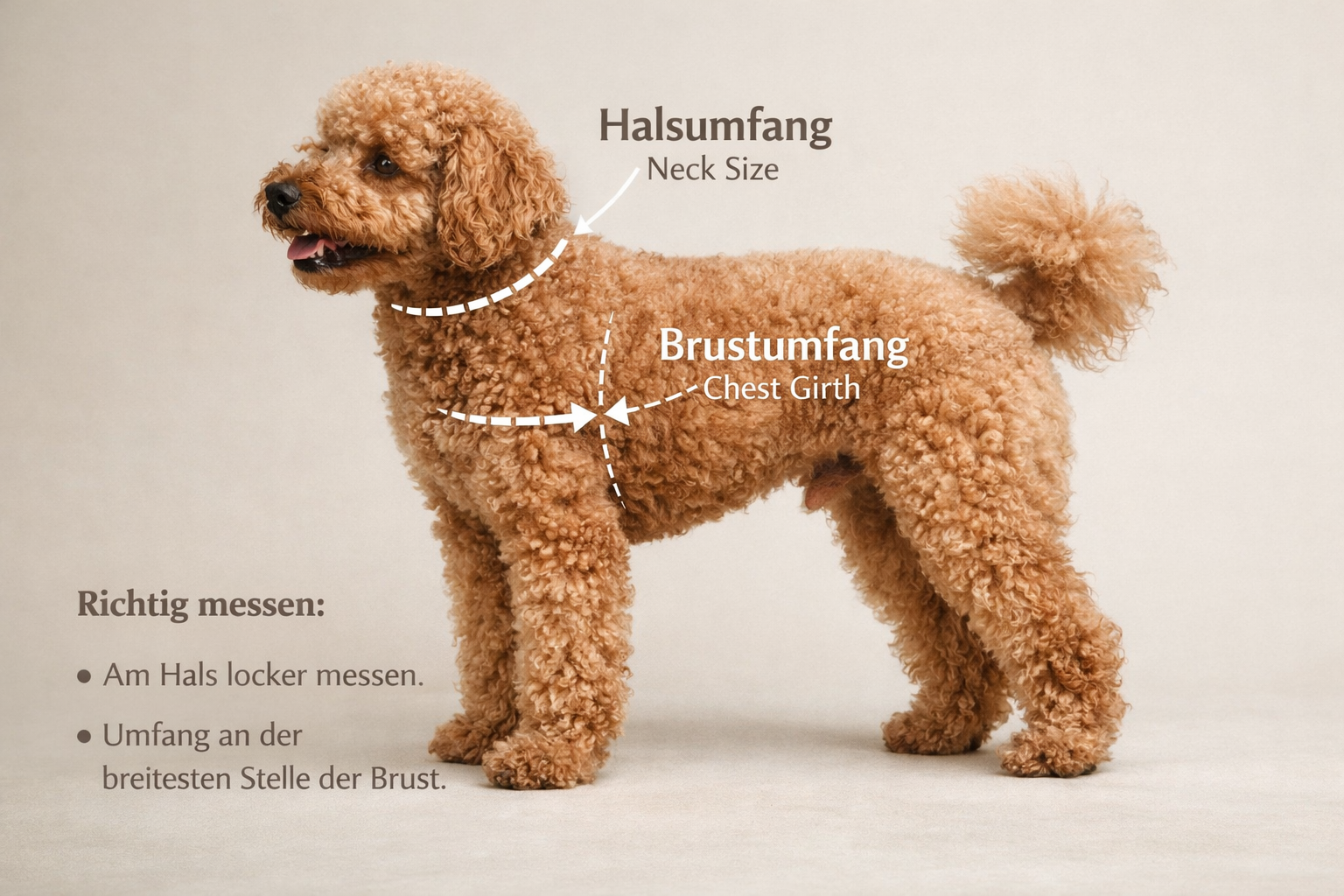 - Für Pudel & ähnliche Rassen empfehlen wir besonders auf den Brustumfang zu achten