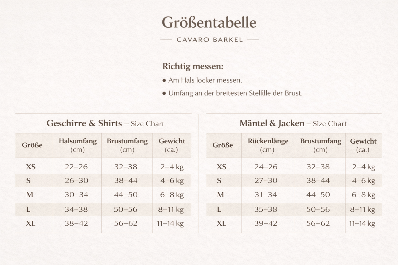Größentabelle – Cavaro Barkel